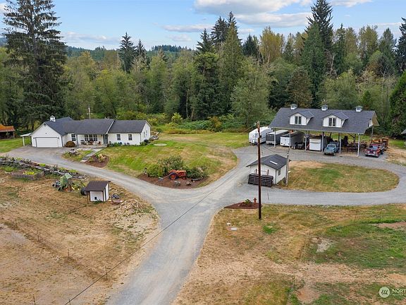 Rare opportunity! This 3,500 sq ft home sits nestled on 15 acres, with Woods Creek amplifying its beauty. At 5 bedrooms & 31/2 bathrooms, this home offers plenty of space. Its oversized basement has a potential mother-in-law apartment. Currently hosting livestock. Ample space for your equestrian dream, mini hobby farm, or business. Bring your equipment, 5bay, 16ft tall 40x60 pole barn with 2000sqft mezzanine for storage or hay. Potential finished barn, shop, business space, or covered arena. Bonus; multiple out buildings including a second rustic 20x30 barn and a RV space with power. Recorded Survey in 2020.