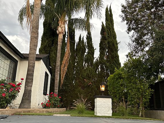 Enjoy a unique custom-enclosed patio, finished in warm wood paneling that creates a serene, lodge-like vibe, ideal for relaxing or entertaining year-round. French doors lead to a peaceful backyard with white stone landscaping, blooming rose bushes, and a private patio area.