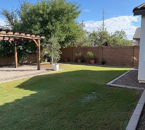 Backs to Greenbelt - 3/ 2.5 single-level Queen Creek home on a gorgeous, landscaped lot with arbor entertaining area in the desirable Gateway Quarter community. This upgraded home features an open floor plan with 9-foot ceilings, garage with work bench area and cabinets, tile flooring in all main living areas, truly custom primary bath that will amaze you and abundant natural light. The modern kitchen with granite countertops is in a huge great room. upgraded cabinetry, oversized island, built-in oven and microwave, gas range, dishwasher, refrigerator, and a walk-in pantry with additional storage space. The custom dining area light can be replaced. - Pets must be approved by Landlord. Includes Washer, dryer, and fridge. Plug for electric car charger.