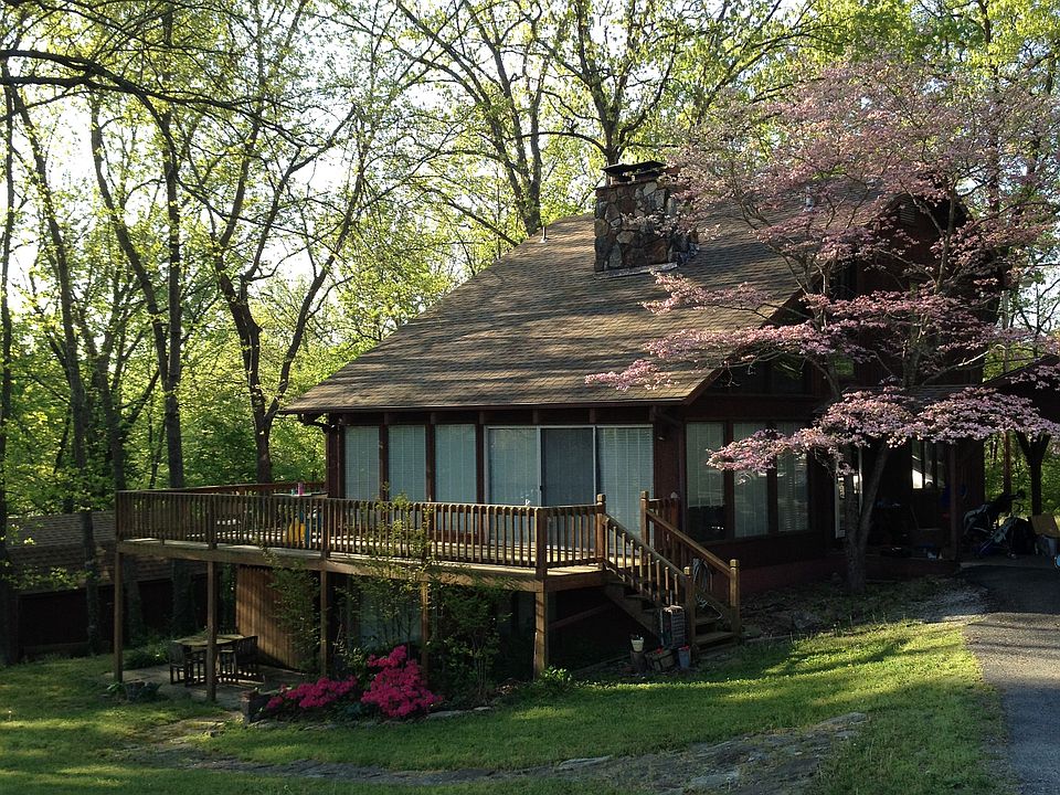 1953 Acacia Club Rd, Hollister, MO 65672 LIST PRICE: $239,900 (Reduced) Call 417/334-6179 or 417/527-5334 for more information or appointment. 5 BR/3BA and 2 Living/Family Rooms in slightly under 2,300 sq. ft of finished space on 1.5 ac. 1. Basement-912 square feet 2. Main level-912 square feet 3. Upper level (loft area with landing)-455 square feet Finished Basement: Living/family room with wood burning fireplace and walk out access, two bedrooms, a bath and two walk in closets (separate from the bedrooms). One of those closets is actually a fairly large room with a small closet underneath the stairwell, but it doesn't qualify as a bedroom because of no windows. (Floor covering carpet and tile) Main level: Three access points to outside: Hallway door to backyard small porch, Main access from 2 car covered carport, a French door access from family/dining area to large deck. This level includes Living/Dining Area, Kitchen (open floor plan with vaulted ceilings with wood beams and all wood plank ceiling and oak hardwood floors), one bedroom, one full bathroom with tub/shower, a utility/mud room that includes an additional shower. Upper level loft area with landing: Two (2) bedrooms with a full Jack & Jill bath w/tub-shower. Flooring: Oak Hardwood, Tile and Carpet Energy: All Electric with a new Trane 4.5 ton Heat Pump and Furnace (less than 3 years old) with Empire Electric. Storage: Outdoor Shed plus storage above the carport. Current Taxes: just less than $1,000 per year. There are no HOA fees even though you are a part of Riverside Estates neighborhood and a boat launch association (for access to Taneycomo) that again doesn't require any dues but does produce some income and the association is trying to be more proactive in some of its work.