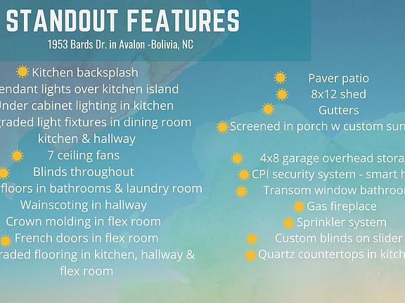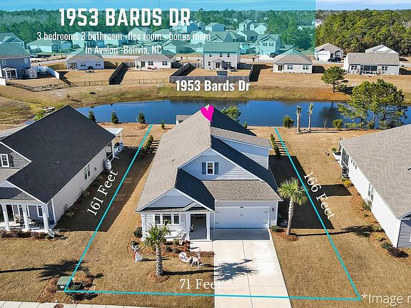 Your search is over. 1953 Bards has a stunning front vinyl shake elevation and you can find it in the ''Freedom'' phase of Avalon, which means ''Earthly Paradise.'' This floor plan is the little sister of the Dover that is currently being built in Avalon and selling for $366,000 without all of these amazing upgrades or this level of finishes! Which makes this a rare pearl!Boasting over 2500 heated square feet! Greeted in the entryway with freshly painted walls and beadboarding trim creates a light and airy coastal vibe! From the moment you walk in the door you can see the water views peeking from the rear of the house. To the left of the front door you will find a guest room, full bath, and storage closet. Speaking of storage, this home wastes no space. If storage is what you need, 1953 Bards Dr has it! Stroll down the beach sand color, luxury laminate plank floor where you will find to the left a flex room featuring beautiful french doors with glass paneling. To the right you will see two more storage closets off the entryway from the garage. Upstairs you will find an open bonus room, full bath, a bedroom with stunning views of the water, and 3 generous walkin storage closets! Staying down stairs we will continue to the kitchen where you will find a nice open floor plan making it great for entertaining around the upgraded quartz countertops in the kitchen featuring a navy subway 3 x 24 inch tile backsplash accenting the gray tone staggered cabinets. Also, including a large corner pantry and new refrigerator. Whether you are staying inside snuggled up by the fireplace, or going out back enjoying the beautiful sunsets over the water. This home has a very relaxing vibe. Take your wine or coffee out back to the screened in porch, if the sun gets too bright don't worry, upgraded sunshades have been installed for extended comfort. If you enjoy the sun, then relax on this beautiful paver patio that the current owners had installed while you wait for dinner on the grill! Need a little more storage outside? Don't worry the 8 x 12 foot shed out back will convey with the homePlus 4 x 8 foot overhead storage shelves have been installed for those extra beach chairs in the garage! Call it a night and head back in where you will find the owner suite located off the kitchen with plenty of space for a king bed and sitting area. Two generous size walk-in closets, double vanity sink with plenty of counter space, and another linen closet. This home features many upgrades that you will not see in the new construction homes being built in Avalon today. To name a few, upgraded light fixtures and ceiling fans, transom windows in the bathrooms, tile floors in the bathrooms and laundry room, CPI security system, gutters, under cabinet lighting, and a termite bond! Plus, in the Freedom section lawn care is included in your HOA dues currently at $172 a month. Location is key, you are only 10 miles from local beaches. The Novant Hospital is just 7 miles away, and with the continuous growth of restaurants and major shops such as Hobby Lobby, Walmart, Belks and Lowes food, makes everything within a 10 to 12 mile radius from your front door. Schedule your private showing today before this home is gone! It is time to start living and loving Brunswick County!
