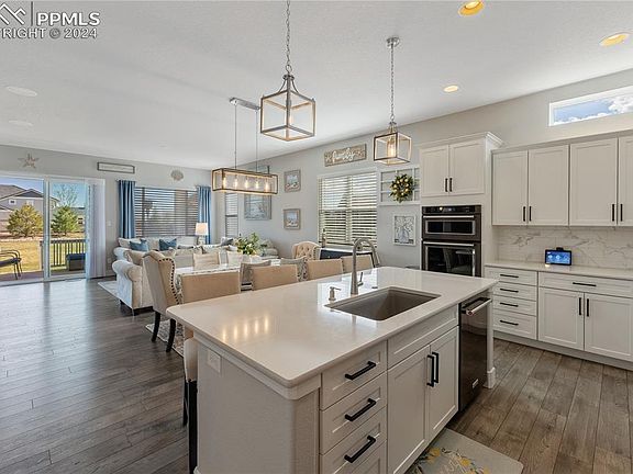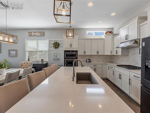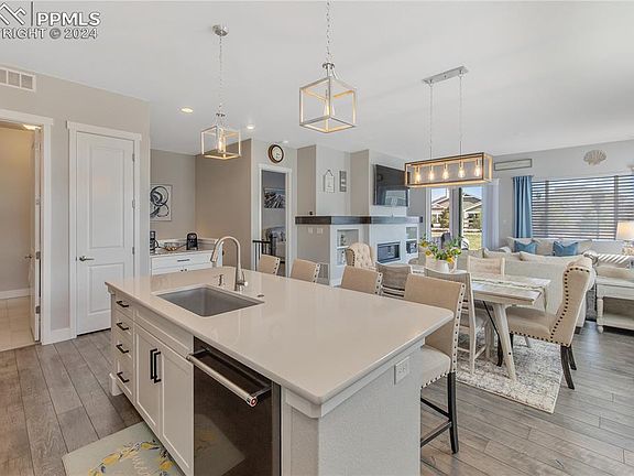 Meticulously Maintained Ranch Style Home w/ Pikes Peak Views Located on a Well Spaced Over a Quarter of an Acre Lot in the Palermo subdivision of Flying Horse * Open Floor Plan w/ 10' Ceilings, Luxury Vinyl Flooring Throughout Most of Main Level * Gourmet Kitchen w/ Stainless Steel Appliances, Quartz Countertops, Gas Range w/ Hood Vent, & Large Island * Great Room w/ Gas Fireplace * Primary Suite w/ Full Bath, Expanded Shower w/ Bench & Dual Shower Heads & Walk-In Closet * Expansive Basement Family Room w/ 9' Ceilings & Wet Bar * Two Large Bedrooms & Full Bath in Basement * Central A/C * Expanded 3.5 Car Garage * Spacious Backyard Great for Entertaining w/ Covered Deck, Large Patio, Hot Tub & Views of Pikes Peak * Main Level Laundry Room w/ Built In Storage & Bench * Smart Home Features Throughout the Home Including Nest Thermostat, Schlage Smart Locks, & Lighting Controls