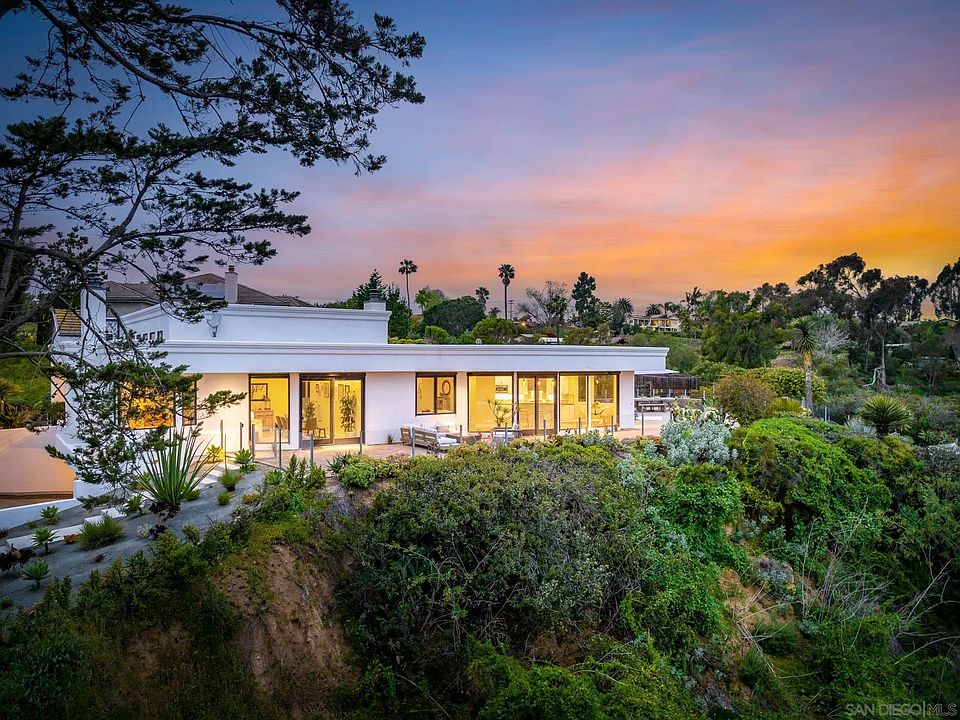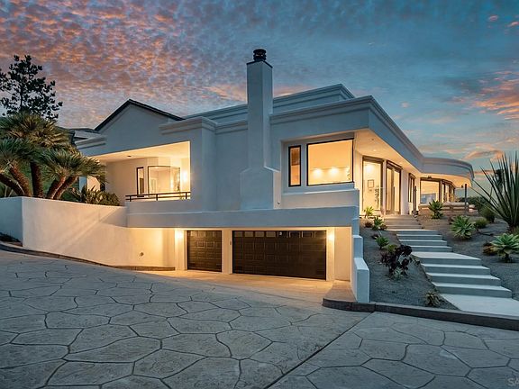 Secluded above a canyon at the end of a private cul-de-sac street in Encinitas, this custom contemporary home is ideally positioned to take advantage of 180º panoramic views. Dramatic vistas of rugged canyons, rolling hills and twinkling lights are enjoyed from indoor and outdoor living areas, including a spacious paver-finished rear patio and numerous indoor rooms that feature oversized picture windows. Custom glass entry doors provide a sleek and modern introduction to the single-level design, where high ceilings, clerestory windows, mitered windows and wood flooring combine to create a genuinely impressive atmosphere. A granite-framed fireplace warms the living room, an office awaits beyond interior French doors, and the dining room is large enough to accommodate memorable gatherings. Another fireplace and built-ins are featured in the family room, and an island kitchen with bar-height counter presents a walk-in pantry, granite countertops, a nook and stainless steel appliances including a built-in refrigerator. Sited on grounds that encompass nearly .87 acres, the three-bedroom, two- and one-half-bath home of approx. 3,052 s.f. features central AC, motorized window shades, a security system, drought-tolerant landscaping and a three-car garage.