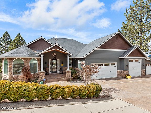 This stunning 4,896 sqft home has endless views overlooking all of Coeur d'Alene in the fantastic and desirable neighborhood of Woodland Heights. Enjoy the picture-perfect sunsets from this west-facing home with views of the entire valley. Its close-to-town location and attention to detail makes this 4 bed/3.5 bath charmer hard to resist! This home is perfect for entertaining with 2 expansive covered decks, an open main floor great room with vaulted ceilings and a chef's dream kitchen! This home has all the extras including designer window coverings, plantation shutters, main floor master suite, media room, home office, wet bar, double-sided fireplace, water feature, 14x14 workshop/craft room, 3-car garage and even a heated driveway!
