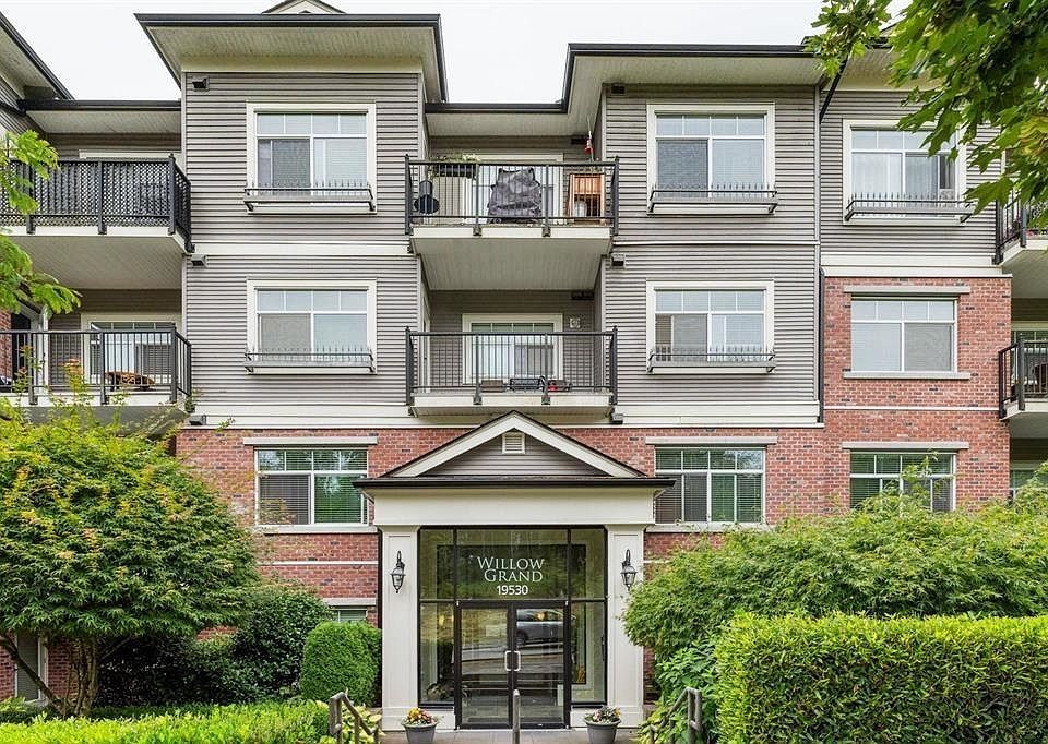 Welcome to Willow Grand in desirable Clayton. This ground-floor 1 bed + 1 bath condo offers 693 sq ft of living space plus generous covered 104 sq ft garden patio—perfect for indoor-outdoor living. The kitchen is appointed with granite counters and stainless steel appliances; the bedroom features double-door access to a spa-style 5-piece bath. One parking stall, storage locker and hot water included. Two small pets (dogs or cats up to 25 lbs) welcome. Centrally located in the heart of Clayton and just minutes from Willowbrook Mall and Clayton Crossing, Future SkyTrain, restaurants, and new community centre - making this the ideal home for first-time buyers or downsizers seeking convenience and calm. Don’t miss out—schedule your viewing today!