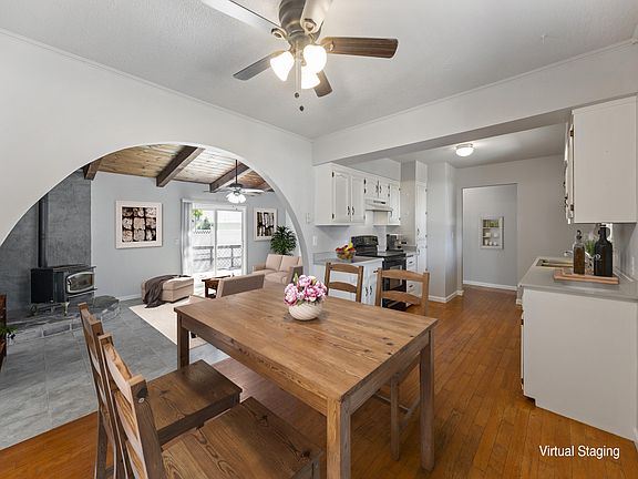 Come enjoy the views from the column arch front porch on this 3 bedroom, 2 bath home!! Step inside to find half vaulted shiplap and wood beam ceilings in the living room, an arched doorway, a wood-burning stove, and tiled flooring. Gallery kitchen with a sweet dining area. Step out onto the back porch for some sunshine or invite guests to grill!
