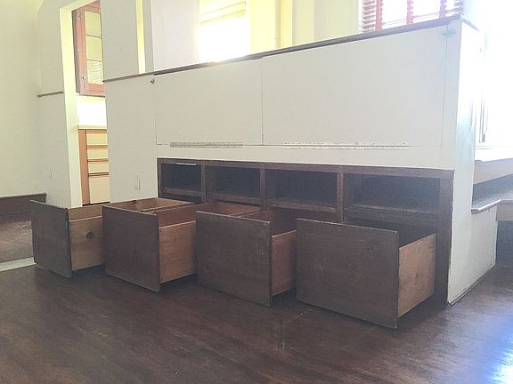 * Built-in loft bed, cabinetry, finished closets, mirrored French doors, ceiling fan.