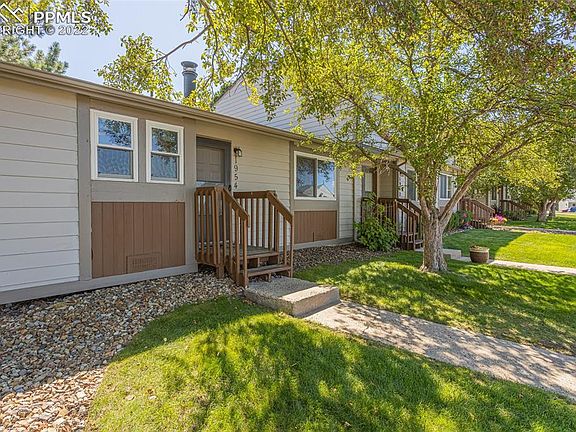This charming 2 bedroom townhome is situated in an established community with plenty of green space, views of the mountain range and Pikes Peak and walking trails. Upon entering you have an open concept living room and kitchen/dining room combo. The kitchen has been updated with new white cabinets, granite countertops and stainless steel appliances. A wood burning fireplace is also available to help keep your home warm during those cold winter months. A space for laundry with electric hookup is also included in your new home for additional convenience. Two bedrooms and one full bathroom are offered with a walk-out from the master bedroom. 2 assigned parking spots located right in front of the property. More open space is directly behind your home. This location is super close to Academy Blvd, shops, restaurants, parks and more! Newer furnace in 2020, and roof replacement is currently being worked on.