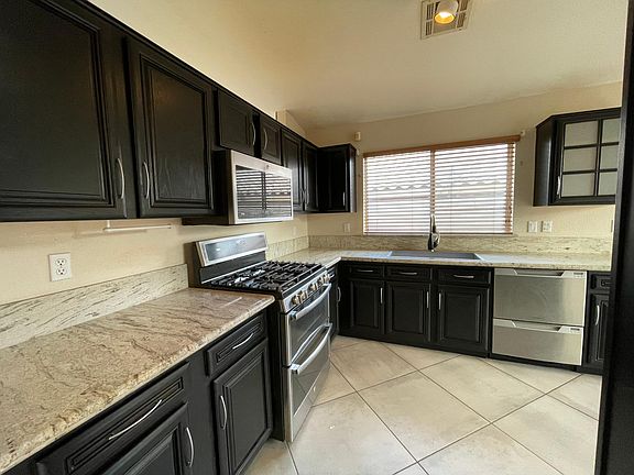Central Location Green Valley Ranch 3 bed, 2 bath, gorgeous 30x30 diagonal laid tile floors throughout, 2 car garage. Entrance opens to a large living area with full wall mirror and warm fireplace. Open & vaulted great room with dining area. Lovely kitchen with dark cherry wood cabinets, cotton white granite countertops, GE Monogram like new Stainless Steel appliances & sunny breakfast nook. Spacious master bedroom and bathroom. Yard backs to quiet street & offers easy to care for desert landscaping with latticed patio cover, BBQ, and plenty of room for entertaining! Garage has built in workshop area and storage units. Zoned for John ES Vanderburg and Coronado High School. At the heart of Green Valley, this home is located close to the District shopping center, Multi-generational Recreational Center, and Paseo Verde Library, Green Valley Ranch Hotel and Casino, and multiple family friendly parks and walking trails.