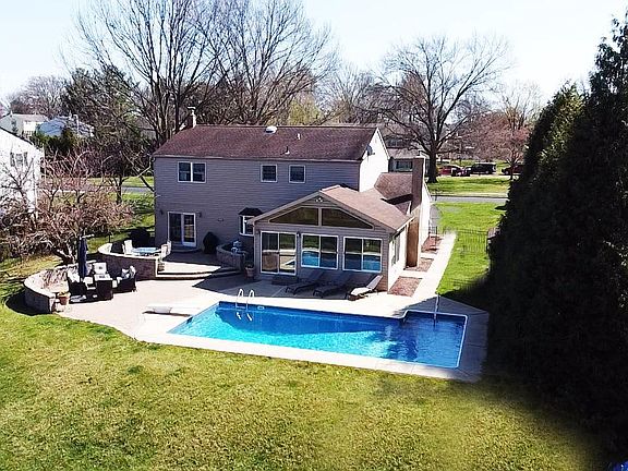 Very likely the best location in Sugar Valley, this terrific home comes with upgrades galore. Township owned land borders the entire rear yard, giving ultimate privacy and maximum use. To take full advantage of this premium location, over 500 sq ft of glass enclosed living area was added to the family room, offering terrific views. The back yard is an oasis featuring an in-ground pool, two tier patio, picnic area, exterior lighting, paver stones and fencing. Enjoy the privacy this property offers as you view the setting sun and watch local wild life and birds. The 27 x 13 kitchen, featuring Aristokraft wood cabinetry and an island, is a chef’s delight. Special features include tile backslash, recessed lighting, double bowl sink, pantry and bay window. Andersen windows are found throughout the house, including an Andersen slider. The 27 x 20 family room hosts a game room area surrounded by floor to ceiling glass windows. In addition, this area has a floor to ceiling fireplace with a pellet stove insert. The first floor is completed with a large living room, with a bay window, and new wall to wall carpeting, updated powder room and main floor laundry. The 2nd floor living area has 4 spacious bedrooms and two beautifully updated bathrooms. The primary bedroom has a walk-in closet and an en suite, that has been completely redone to include a soaking tub, walk-in shower, with seamless door, and double bowl vanity. The hall bath has an updated vanity and recessed lighting. Three nicely sized bedrooms, with six panel doors, complete the second floor. Need more space? The finished basement has been recently updated with new paint, carpet, plenty of recessed lighting and electric baseboard heat. In 2023, the front exterior was remodeled with stone veneer for a distinct look. Recently landscaped front yard and stamped concrete walkway add to the welcoming appeal. This HOME IS A MUST SEE!