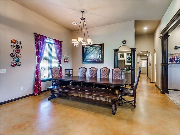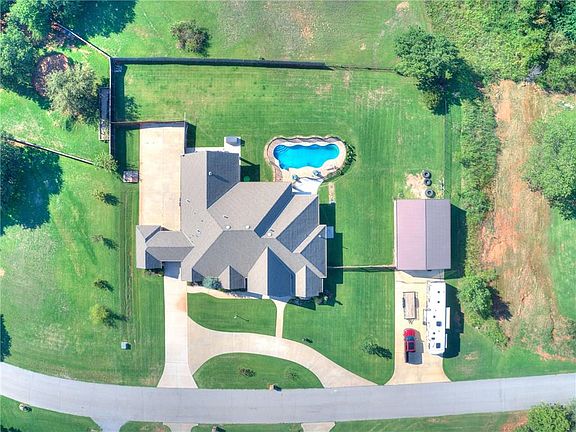 From the striking exterior to the oasis in the backyard, you will fall in love with this special home. So many amenities...Spacious open living, dining area, large study with built-ins, chef worthy kitchen, media room upstairs...so many features to enjoy. Amazing heated saltwater pool, covered patio-outdoor kitchen, 30 X 40 shop building. There are 5-6 bedrooms, 4 full baths and 2 half baths (one for the pool), in-ground storm shelter, 2 car attached garage and 2 car detached with porte cochere for more covered parking. All driveways are clean concrete. The kitchen has an island with veggie sink, 6 burner gas range, walk-in pantry, tons of cabinets and beautiful granite counter space. The living area is bathed in sunlight with the floor to ceiling windows that overlook the backyard; also has built-ins on each side of the fireplace.; there's even a butlers pantry next to formal dining!