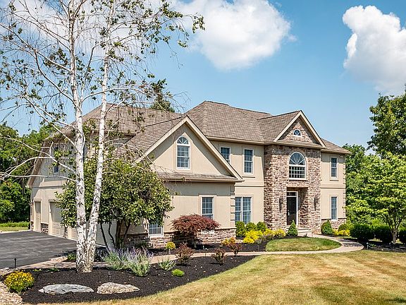 Beautiful Colonial, grand yet inviting, set on a lovely cul-de-sac on nearly 3 acres of lush grounds in prime Saucon Valley. Privatized by mature trees & ready for outdoor enjoyment with a multilevel Trex deck, brick paver patio with fire pit + generous green lawn for kids to play. A soaring entry foyer welcomes you into elegance, revealing gorgeous details throughout the expansive home including rich oak floors, tasteful moldings & built-ins, open arched doorways & expansive light-filled windows. The gracious layout has a seamless flow for entertaining with a large living room, formal dining room, chef's kitchen accessing the deck, window-lined breakfast room & 2-story family room w/a gas fireplace. An office, 1/2 bath, laundry & mudroom complete the main level. 4 upstairs BRs include a luxe master suite w/sitting room, walk-in closet & en-suite bath. Finished day-lit lower level has a rec room, bar, exercise area & half bath. Oversized 3-car garage, generator & more! Saucon Valley SD 2018-07-17
