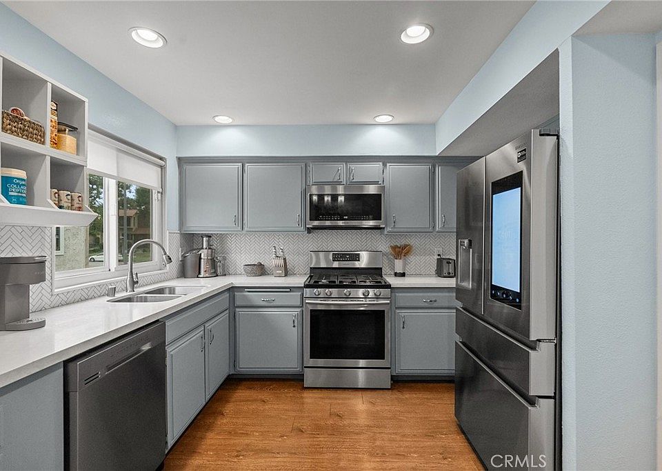 Beautifully Remodeled 3-bedroom + Bonus Room/Office offers the perfect blend of comfort and style. Step inside to a spacious living room featuring a cozy gas fireplace, 6 recessed LED smart lights that change colors, modern flooring, and abundant natural light from a sliding glass door leading to a private patio. The patio, ideal for outdoor enjoyment, boasts new fencing and is perfect for enjoying the California sunshine. The kitchen is a chef's dream with sleek quartz countertops with stylish herringbone tile backsplash accented with high end and matching Samsung stainless steel appliances. Open to the dining area, this space is perfect for hosting friends and family. A convenient indoor laundry area is also located on this level. You'll feel the true modernization with all new 5 panel Frosted Glass Bianco Noble Finished doors throughout the home. Upstairs, you'll find all three generously sized bedrooms, each with ceiling fans for added comfort. Primary bedroom with city views and en suite bathroom. Updated tiling in the shower and new vanity with led lighted mirror that defrosts. Guest bathroom features a barn door, LED mirror that defrosts and tiled shower with new vanity and faucet. Plus, enjoy the bonus room which is ideal for a home office or gym, equipped with its own AC unit for added convenience. Seller purchased and will provide a matching barn door for the primary bathroom but hasn't installed it. Enjoy the peace of mind that comes with living in a gated community with a private pool, while also being close to shopping, restaurants, Pierce College, the 101 Freeway, Kaiser, Westfield Mall, and parks. Be home for the holidays!