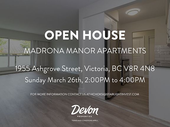 AboutReceive 1 Month FREE RENT When You Sign a New 13 Month LeaseMadrona Manor is a four-storey building offering 31 one-bedroom and 11-two bedroom units, totalling 42 rental units. All available units have been newly renovated with stainless steel appliances, new cabinetry, and beautifully upgraded kitchens and bathrooms. Located in Fernwood, it is in close promixity to schools, parks, shopping, and bus routes, providing convenient access to all amenities for residents.*Terms and conditions apply. To be eligible, you must be a new resident and sign a lease for the specified lease term. The offer is not applicable for those who transfer within the Devon Properties portfolio. This is a one-time offer and may be withdrawn or extended at any time by Devon Properties Ltd. Offers, benefits and services are subject to change and are not an essential, required, or ancillary service provided by the Landlord.Community AmenitiesElevatorsResident StorageCovered Parking (Added Charge)Laundry (Coin Op)RecyclingDishwasherStove and OvenRefrigeratorSuite AmenitiesWindow coveringsUtilities IncludedHeat