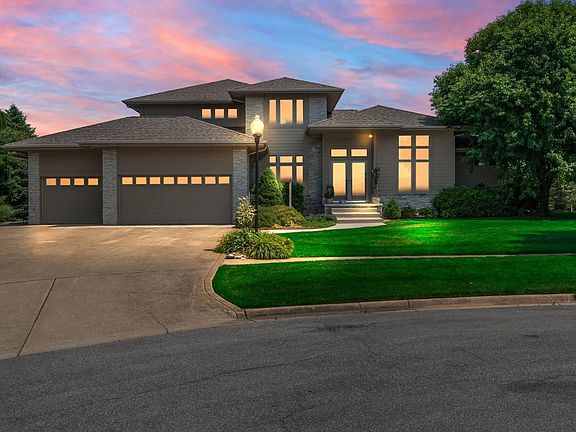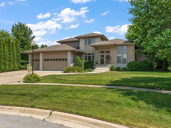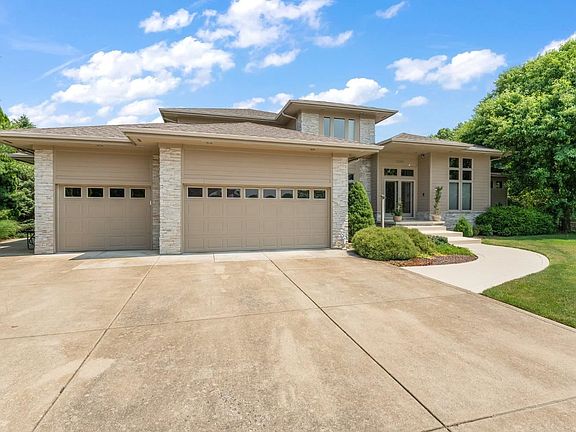 Boasting sophistication, elegance & sunlight, this contemporary home is nestled on a cul-de-sac in the highly desirable gated community, Sand Creek. The attention to detail in this home is impeccable, w double door/breezeway entrance, 12ft ceilings first flr & office, main flr primary suite, expansive windows, finished basement w bar, sitting rm fireplace & a 3.5 garage w 12ft ceilings. The garage features side loading garage door for ease of golf cart entrance or perfect for setting up indoor golf to practice your swing all year! Enjoy the ultimate 4seasons porch year around w hot tub, fireplace & the ease of indoor grilling. Spacious eat-in kitchen features new appliances, walk-in pantry, beautiful cherry cabinetry, breakfast bar seating, island, space for a home computer/command center & adjoins the formal dining rm. Inviting amenities include mud room w walk-in closet, extra closets upstairs, first flr laundry, & 2 bonus spaces. Inquire about Sand Creek Country Club Membership.