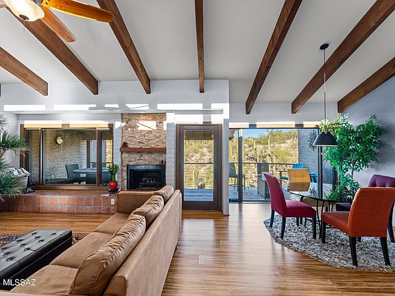 Catalina Foothills. Prestige. Pristine. Picturesque. Pride of ownership & filled with luxury upgrades including: Unique brushed bronze appliances; luxury induction cooktop, smart/touchless kitchen faucet; hot water re-circulator; fireplace w/floating mesquite mantel; exceptional Pella windows & doors w/casement windows; tiger stripe bamboo flooring; lighted storage under the stairs; privacy in-pane screens in master and front door; master has French doors to covered-extended patio with newer stained concrete w/pony brick wall to keep critters out; shower with dual heads & separate controls; alder wood barn door w/full length mirror on back; HOA includes pool, courts, trash, fire protection & front yd maintenance. Front water feature stays! Guest parking across the street. 2 c/garage