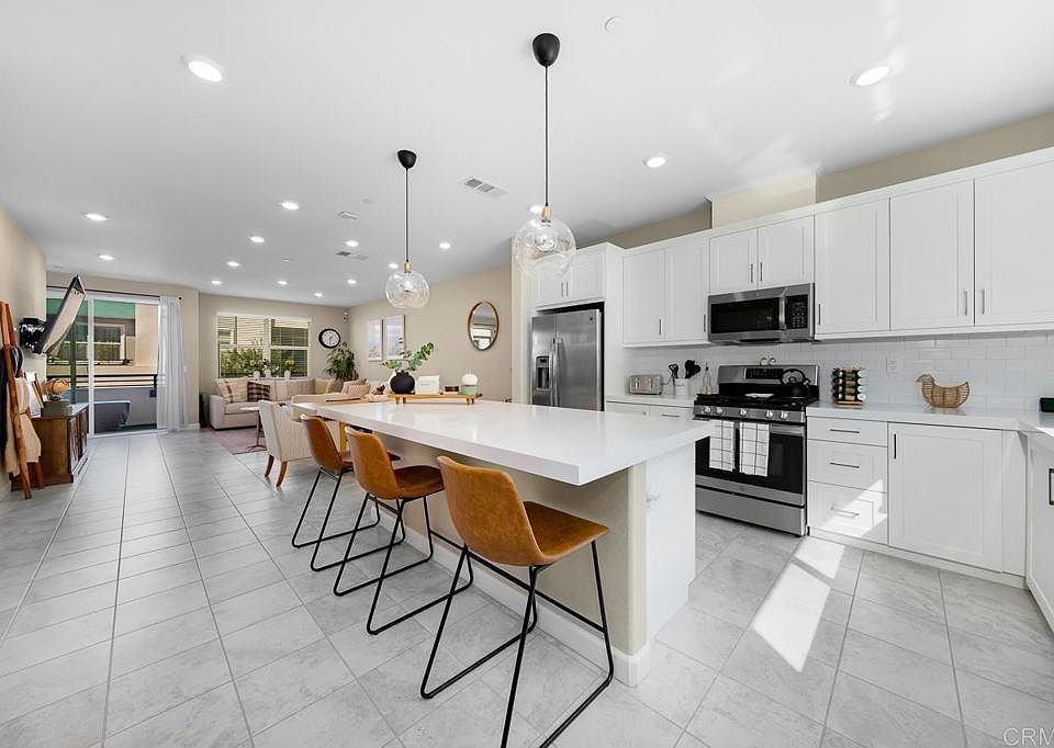 Welcome to urban luxury living at its finest! Nestled in the heart of Millenia, Otay Ranch's premier community, this exquisite 4-bedroom, 4-bathroom home offers an unparalleled blend of modern elegance and convenient living. Built in 2021 and meticulously maintained, this property is a testament to sophisticated design and high-end finishes. Step into the welcoming embrace of this 1,819 square feet sanctuary, where a seamlessly open concept living space awaits. The ground floor boasts a private bedroom with an en-suite full bathroom, providing comfort and convenience for guests or multigenerational living. The gourmet kitchen is a chef's dream with top-of-the-line stainless steel appliances, sleek white cabinetry, and stunning quartz countertops, all centered around a large island – perfect for both casual dining and entertaining. Modern pendant lights and abundant canned lighting throughout the home enhance the ambiance, creating a bright and inviting atmosphere. Natural light floods the space, further accentuating the beauty of the interior. The adjacent walk-in pantry adds practicality to luxury, ensuring ample storage for all your culinary needs. Step outside to the patio balcony off the living room, where endless possibilities unfold. Whether sipping morning coffee, immersing yourself in a good book, or simply unwinding, this space invites you to create cherished moments against the backdrop of urban sophistication. As you ascend to the third level, discover a true retreat in the primary bedroom. Dual sinks, beautiful white cabinetry, and his and hers closets frame a space designed for relaxation and rejuvenation. The other generously sized bedrooms and conveniently located washer and dryer complete the upper level. This home is equipped with a tankless water heater, central heating, and air conditioning, ensuring comfort year-round. With solar panels, energy efficiency is a hallmark of this property, offering both sustainability and cost savings. Vibe at Millenia community enhances the lifestyle with resort-style amenities. Immerse yourself in the community pool, entertain at the BBQ areas, or gather around the modern fire pit for memorable evenings. Cabanas provide a touch of luxury for all residents to enjoy. The location is a key highlight – Millenia of Otay Ranch is a well-planned new urban-style community, San Diego's next iconic urban village. Enjoy the convenience of walkable living, top-rated schools, numerous parks, and breathtaking mountain range views. Only 15 minutes east of Chula Vista Bay, this peaceful neighborhood offers a perfect blend of tranquility and accessibility. Indulge in the pinnacle of urban luxury living – make this stunning property in Millenia your new home!