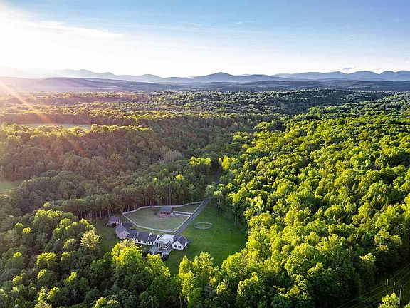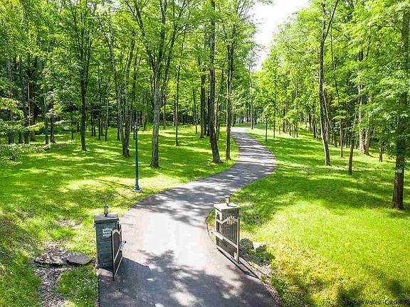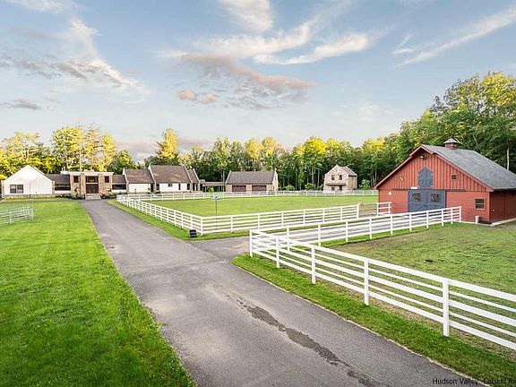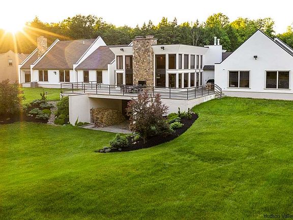 A long winding drive leads to this dramatic private108-acre estate, which is crowned by a stunning 6000 square-foot modern single-story home that's complemented by a two-bedroom guesthouse, four-car garage with apartment above and a four-stall barn. The land offers a combination of open fields, woods with riding trails and extensive frontage on the Rondout Creek. The massive great room, a glass box of sorts with 16-foot ceilings, is the heart of the stone and stucco main home. A double-sided fireplace, which is also open to one of the bluestone patios, anchors the room on its southern exposure. It's the ideal space for entertaining on any scale, from intimate dinner and movie nights to elaborate catered affairs. The kitchen is outfitted with the highest caliber of appliances and cabinetry, which are echoed in the wet bar and serving area on the north wall of the great room. The house's west-facing guest wing includes two ensuite bedrooms and a den, which can easily function as additional sleeping space. The east wing incorporates what the owners call his and hers masters - two adjoining bedrooms, one with a fireplace - and opulent his and hers bathrooms, his with a large soaking tub and walk-in shower, and hers with a large walk-in shower and bidet. A large home office, lofted gym, two powder rooms and a mudroom complete the main living level. The full basement has 12-foot ceilings and incorporates a billiard room, movie room and full bath, as well as an enormous fireplace, and offers direct access to the beautiful outdoors. A covered walkway leads to the four-car garage, above which the one-bedroom apartment serves as additional guest space or caretaker's quarters. The two-bedroom, two-bathroom guesthouse is like a precious jewel box in comparison to the main home, yet was built with the same care and attention to high quality materials and workmanship as all aspects of this impressive compound.