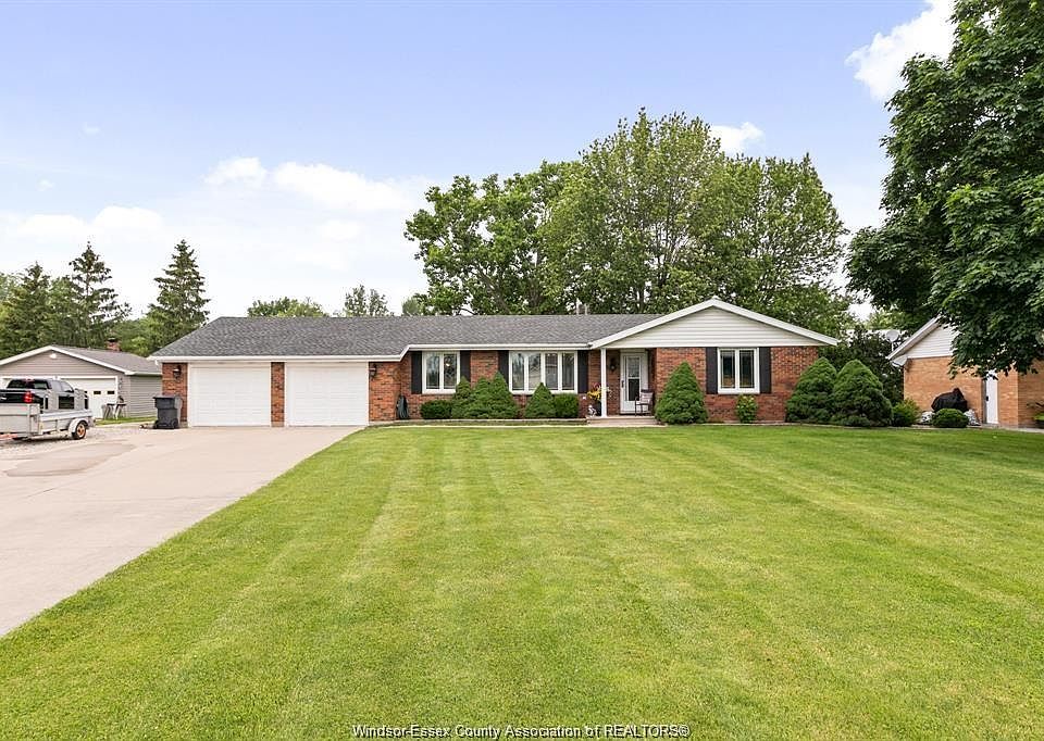 This Beautiful Brick to roof Lakeshore Ranch on mins from Highways 3 for Us and city Commuters, all on a huge 100 x 193 ft Country setting lot has 3 bedrooms and 2.1 baths, Master bedroom has ensuite bath with stand up shower, main bath has a jacuzzi tub and powder room off back mudroom by pool and patio, freshly painted thru out, kitchen with granite counters, breakfast bar overlooking sitting area with gas fireplace, overlooking beautiful covered patio area and large 20 x 40 heated inground pool with sand filter (2023) (New AI pool pump 2025) Energy efficient heater(2023) and updated liner with transferable warranty, with two pool house cabanas and surrounded by white aluminum fencing; full basement inspected and updated by advance basements, septic tank was emptied in May 2025; Furnace C/A (2017) 2.5 car garage with epoxy floor. Security cameras and all equipment included and back covered professionally installed awning, fenced in dog run at North side of home.