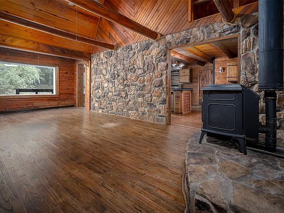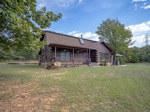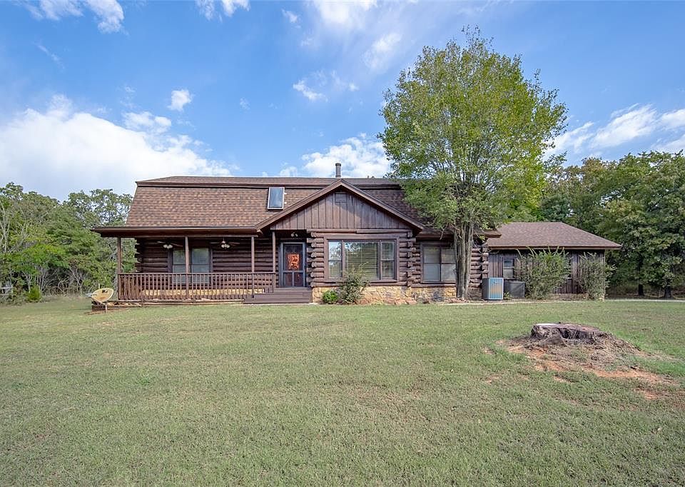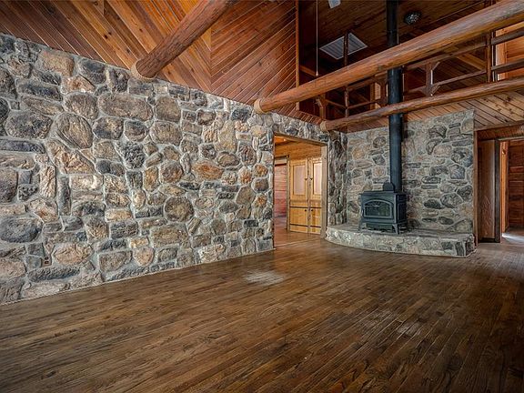 This is a one-of-a-kind log home, custom-built log by log, on 19.7 acres. You won’t find another property quite like this. It has 4 bedrooms, a flex room, 2 full baths, and a powder bath. The woodwork and design are like no other. Primary bedroom and bathroom are downstairs and the other 3 bedrooms, plus a bonus/flex space and bathroom are upstairs. This home features a stone wall with a wood-burning stove and a wood design on the other wall. Huge cedar beams above the living room are visible from upstairs and downstairs. The kitchen has a center island for food prep and storage, soapstone countertops, electric oven and gas range, a built-in pizza oven, built in microwave slot, a bar area with a sink and the refrigerator stays. Downstairs also includes a formal dining and second living area. The wood designed staircase is beautifully designed. There is storage under the staircase as well. The primary suite downstairs has room for a sitting area. The bathroom has double vanities, a claw tub and separate shower. The large laundry room is right off the primary bedroom which is very convenient. Outside there is a large barn with 4 bays and has been plumbed, an open storage shed and a carport. Additional extras include: a storm shelter, 2 wells, septic, and various kinds of fruit trees. Come enjoy the peace and quiet of country living- the thought given to this beautiful home make it the most comfortable, and comforting place you may ever experience.