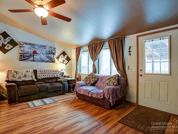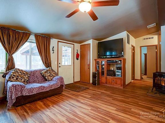 Great starter home located on .61 of an acre in Deschutes River Woods. On a paved road this 3 bedroom, 2 bath 1995 Manufacture home is 1300 Sq ft. Home features an attached (partially insulated) double car garage, pellet stove, ceiling fans with vaulted ceilings and lots of windows for natural light. Seller installed upgraded Vinyl flooring in the living room. Back yard is fenced and goes beyond the picket fence..