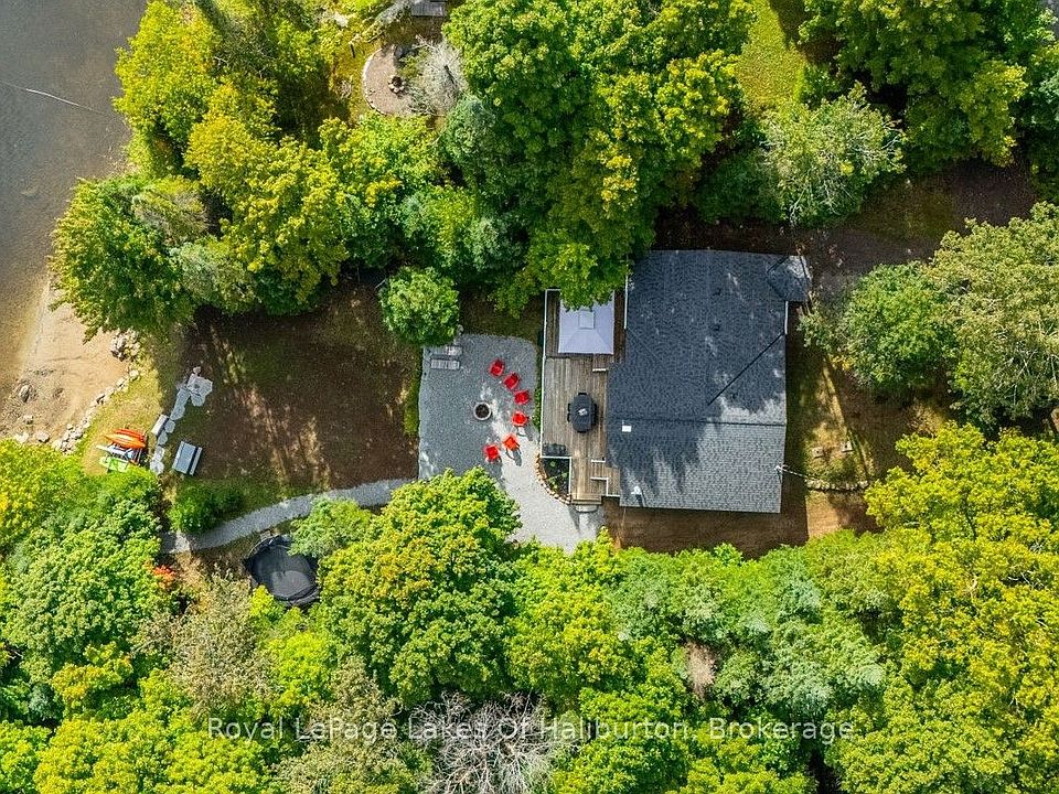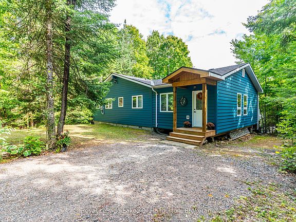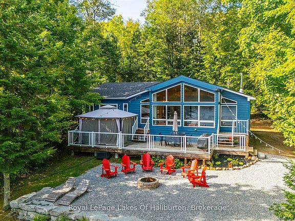 Welcome to this inviting 4-bedroom, 1,400 sq ft year-round home or cottage on Little Glamor Lake. With 110 feet of private shoreline, sandy beach, south exposure, and a deep lot surrounded by mature trees, this property offers both privacy and stunning natural beauty. A waterside firepit, gazebo, and tiered decking with glass panels provide the perfect spots to take in the lake views in every season. Step inside through the covered porch into a spacious foyer and be greeted by a bright, open-concept layout which flows into the formal dining area that is filled with light and has a sliding door walkout to the lakeside decking. The heart of the home is the open-concept living area, where cathedral ceilings, wood beams, and a wall of windows frame breathtaking water views. The new kitchen is designed for entertaining with a large island and sit-up eating bar, coffee station, deep oversized sink, plentiful cupboards and built-in stainless-steel appliances including oven, microwave, fridge, dishwasher and countertop stove. Pine cathedral ceilings with ceiling fans add warmth and character throughout the living areas and three of the bedrooms. A woodstove keeps things cozy on cool nights, complemented by a propane stove and electric baseboard backup. The main floor also includes laundry off the dining room and a 4-piece bathroom with a deep tub. With level topography, excellent swimming and fishing, and room for outdoor play, this property is perfect for families and gatherings. Close to ATV and snowmobile trails and only minutes to Haliburton Village for all your amenities, its a four-season retreat ready to enjoy. Many recent upgrades , see list in document section.