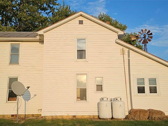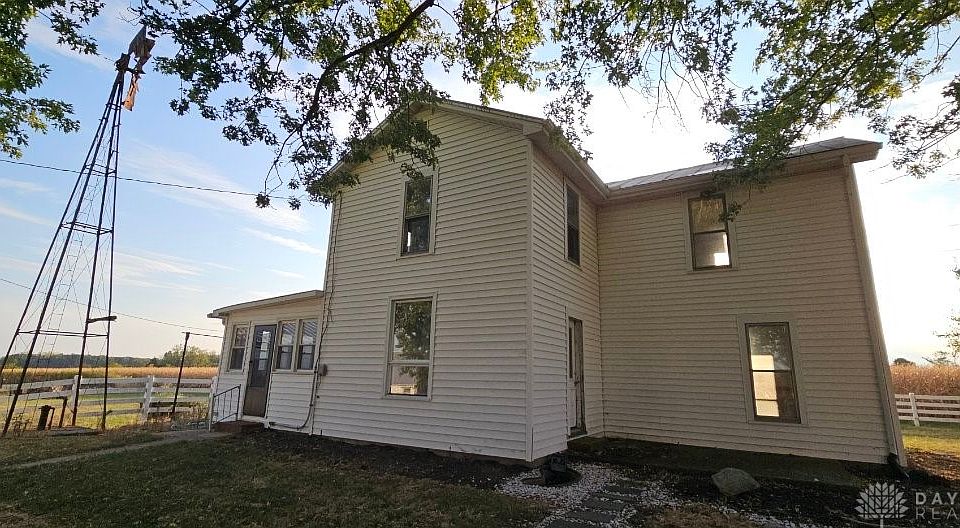 Welcome to a lovely hard to find setting with a two story home offering 3-4 bedrooms on 5 acres. This 1908 sq ft. vinyl sided home has newer carpet and luxury vinyl plank flooring. The spacious kitchen has been updated with white cabinetry, white/grey countertops with pull out drawers, two pantries, coffee bar, farm sink, new faucet and accented with black hexagon shape tile backsplash. The living room and family rooms are very spacious allowing a great space for gatherings. The upstairs has 3 large bedrooms with lovely views of farm ground. Two bedrooms have newer carpet and the third has the orginial wood flooring. The downstairs bedroom could also be used as your home office and the full bath with tub/shower unit is conveniently located off this room or enter from the hallway. The utllity room with vinyl windows has lots of natural light perfect for doing laundry and there is also cellar access that houses the newer furnace, well pump and water heater. The home does need some replacement windows. The setting is so beautiful and the old wind mill adds and extra touch of nostalgia. The white vinyl fencing is very attractive and the barns would be perfect for 4-H livestock projects. The barns are in need of some TLC. This property is conveniently located close to St. Rt. 127 and interstate 70. Welcome to the peace and quiet of the Country and enjoy the beautiful sunrises and sunsets. Selling As-Is.