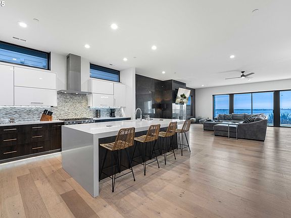 Welcome to "The Bluffs", a waterfront subdivision with panoramic views of the Pacific Ocean, sand dunes, and the Bay. With over 4,700 square feet of living space, this gorgeous home offers an open and comfortable floor plan. Among other great features, the main level great room includes a stunning kitchen with high-end appliances, quartz counters, custom cabinets, and an island with a pop-up flat screen TV! There is a spacious pantry and a powder room adjacent to the kitchen. This main floor living room, kitchen, and dining area is perfectly positioned to take in the view from every angle! Near the entryway is the first suite, which is very spacious and comfortable. The true primary suite is located at the back of the house on the main level, and overlooks the water. It is one of the most beautiful rooms in the house! In addition to the endless views, there is also an enormous ensuite bathroom with a double sink vanity, heated tile floors, a generous shower with an invisible drain, and a fabulous walk-in closet. The second level features a large family room with a gas fireplace overlooking the bay, as well as another powder room. An impressive view can also be enjoyed from the den, which has access to the patio. On the other side of the den is the third bedroom and third full bathroom. A double garage and off-street parking provide plenty of parking and storage space. The privacy of the property is enhanced by a security gate and minimal traffic. Along with heated tile floors, high-quality appliances, an on-demand water heater, and solid core doors, two gas fireplaces are included among the high-end features. The property is unique in that it is equipped with a fire suppression system, allowing it to qualify for a short-term rental and income possibilities. Don't miss this one-of-a-kind masterpiece!