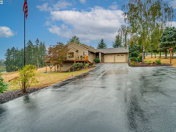 Available Now! 5 acres with RV parking, and territorial views. Main level has kitchen, living room with fireplace, dining room, primary suite with walk-in closet, huge windows looking out onto a wraparound deck and beautiful field. Lower level has living area with fireplace, 2 additional bedrooms + office, and bathroom. Pets and livestock welcome - chickens, cows, goats, etc. Fenced field, small chicken coop, metal outbuildings, garden. Must see! 3 minutes to Sherwood Highschool, 20 minutes to Nike World Headquarters, 27 minutes to Intel.