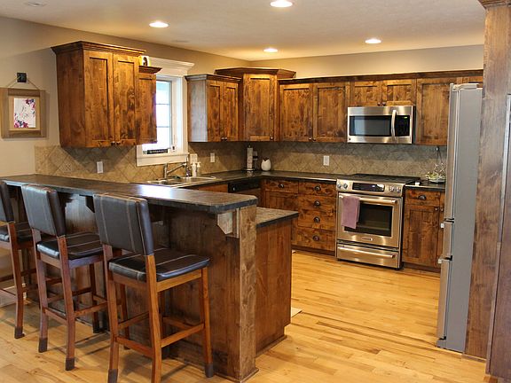Serene country living with over 6 acres! Beautiful 5 Bed, 5 Bath, 2 story home surrounded by lots of trees. Completely updated and remodeled. Offering almost 4,000 finished square feet. Features include wood flooring throughout main level, stainless steel appliances, rustic knotty cabinets throughout, large bedrooms with walk-in closets, mudroom off garage, laundry on main level and upper level. Spacious main level master bedroom includes jacuzzi tub, double head tiled shower, and walk-in closet. Newly finished lower level with family living area, bathroom, an additional room, a cozy nook, and storage areas. Spacious four car garage with workshop. Watch the wildlife and sunrise over the rolling hills on the charming wrap around front porch!