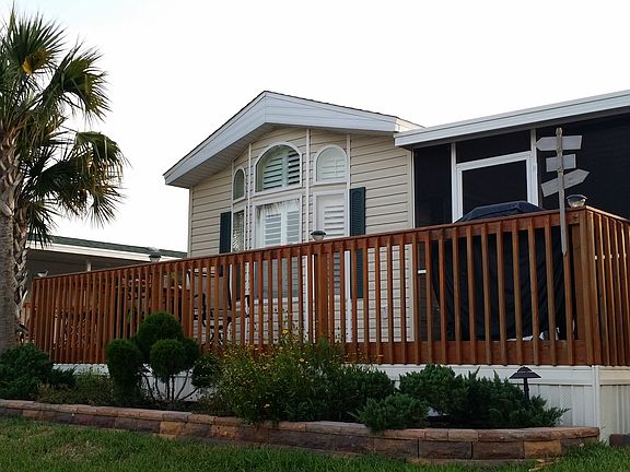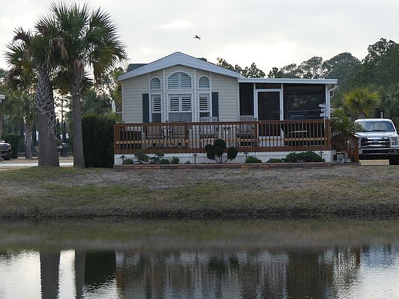 This is a "Park Model" home built to Florida Hurricane zone III standards. It has a 12' x 40' screened porch and rear deck facing man made lake approx. 10 x 24. It is fully furnished and located in a gorgeous RV resort community. The resort has all the amenities including TV cable (included), water (included) two pools, fitness center, children play area and much more. This is a gated community. The home has many, many upgrades and conveniences. It also has full RV motorhome hookups in the driveway beside the house. 24 hr. security. Very energy efficient.