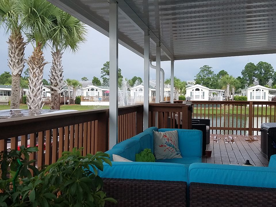 Condos too expensive, too noisy, or not enough outdoor space for kids, toys, and pets? Consider a Park Model! Two bedrooms, 1.5 baths, a full kitchen with eating area, living room with electric fireplace and queen-size sleeper sofa, washer & dryer, and laminate floors throughout. Partially covered (over 500 square feet) wrap-around deck overlooks one of two stocked fishing ponds. Oversized brick paved lot allows storage of RV (with full hookup), boat, jet skis, golf cart, etc. at no extra charge! This home is located within an upscale resort and includes 2 pools (heated), dog park, clubhouse, and pavillion for family gatherings. Also has fitness center, playground, volleyball, pickleball, bocceball, shuffleboard along with hot tub & 2 intimate gathering areas with firepits. Close to public beach (shuttle service available), restaurants and shopping. Walking distance to major attractions. Lot lease includes above amenities, water, trash (picked up 3 times daily), basic cable, wifi, lawn care, & pest control. Quiet, clean, beautiful upscale RV resort. Fraction of the cost of a condo. Rental income potential. Furniture negotiable.