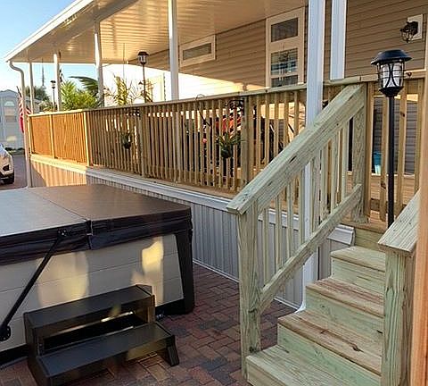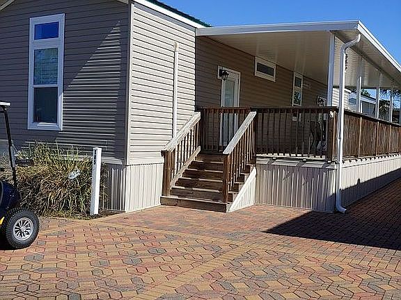 Gorgeous 2019 build, furnished 2BR with 1 and 1/2 baths. Lots of cabinets in the kitchen which has microwave/convection oven, range top, wine cooler, side by side refrigerator/freezer, double stainless steel sink, dishwasher and disposal. Full bath has deluxe walk-in shower. Large covered porch. RV hookup included! The park has tons of amenities such as 2 swimming pools, jacuzzi, pickleball courts, work-out room, dog park, shuffle board, horse shoes, and community room. Is pet friendly.
