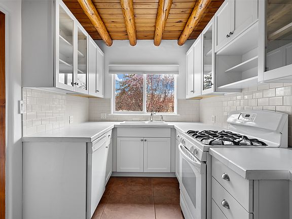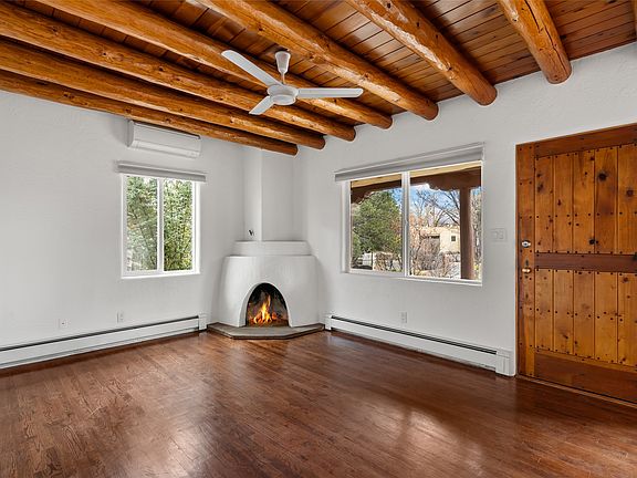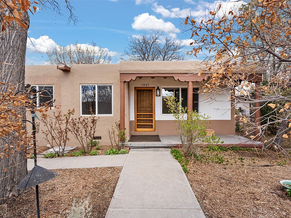 This charming home is located on one of the nicest streets in Casa Alegre just a short walk from the park on Hano. It has been updated over the years without losing its original Stamn character. The living room is bright and light with a kiva fireplace and beyond it is a beautifully updated kitchen. There are three serene bedrooms and two remodeled bathrooms. Details included in the house are hard wood floors, kiva fireplace and vigas in most rooms. The yard has many beautiful deciduous trees, bushes and plantings and a wide portal to enjoy it. Various upgrades that have been done are - new sewer line to the street, windows replaced, newer hot water heater, boiler and washer/dryer, mini splits in two bedrooms and living room and new tile in the third bedroom. This truly is a wonderful property that is not to be missed!