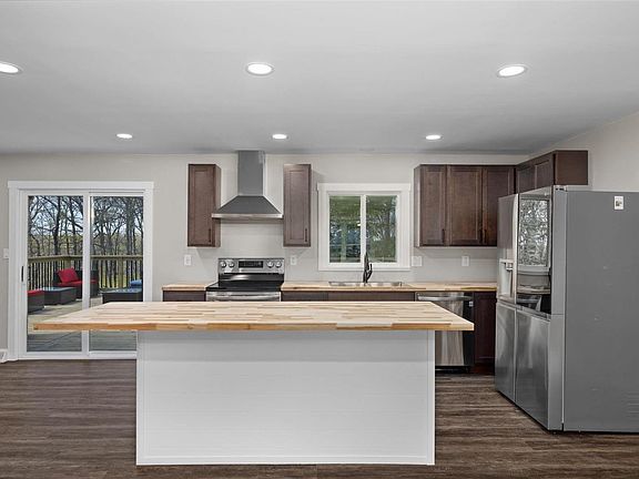 The stunning kitchen boasts a huge center island with seating for 6, newer cabinets and butcher block counters, and gorgeous newer appliances, including a smart refrigerator.