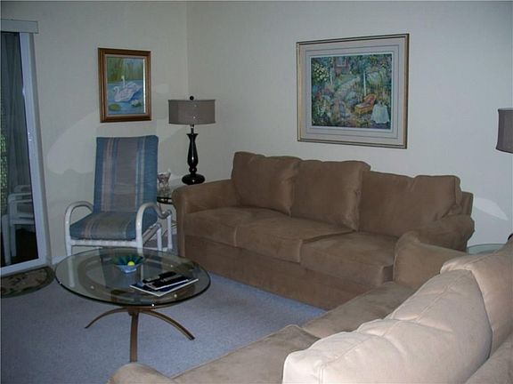 Beautiful second floor unit with a grand golf course view. Mirrored dining room wall. Sliding glass door from living room is impact glass. Access to large screen porch, from living room and master bedroom. Pull down shutters on porch. Furniture is negotiable. Unlimited golf, water/sewer/basic cable all included in maintenance WIFI at the main clubhouse, community pool, 2 fishing piers, 2 clubhouses, bocce, billiard ping pong room, exercise room, library, putting green, shuffleboard. Join the canoe / kayak club too