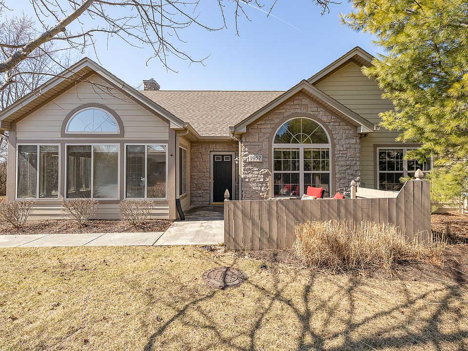 Welcome to this beautiful ranch townhome in the Timbers Ridge Villas maintenance free living clubhouse community! This 2 bed, 2 bath home, with extra den and 4 seasons room is exceptionally CLEAN, move in ready, and an end unit that backs up to a wooded private area at the end of the street. As soon as you enter, you'll notice the open, airy floor plan and vaulted ceilings in every room! Notice the new entry way vinyl flooring, brand new carpet, and fresh paint. The family room, complete with fireplace also flows seamlessly into the bright four seasons room with plenty of windows and beautiful french doors. The kitchen has an abundance of oak cabinets, offering plenty of storage and counter space. The spacious primary bedroom features an ensuite bath with double sinks and vanity sitting area. Separate water closet, stand up shower, and larger walk in closet complete the space. The second bedroom offers ample closet space and is conveniently located next to the full bath, making it an ideal space for guests or family. Additional bonus room with french doors that can be used as a den, office, or flex space. Laundry room features some hanging space and oak cabinet storage. Clean 2 car garage! Outdoor patio area perfect for morning coffee. Brand New Carpeting 2025, refrigerator 2024, Water heater 2022, roof 2022 and fresh interior paint 2025. Enjoy the host of amenities here at the villas including, outdoor swimming pool, picnic area, mini gym, and meeting/party room with kitchen. Assessment dues include Common insurance, clubhouse, exercise room, pool, exterior maintenance, lawn care, and snow removal. Close to restaurants and shopping! Schedule a showing today!