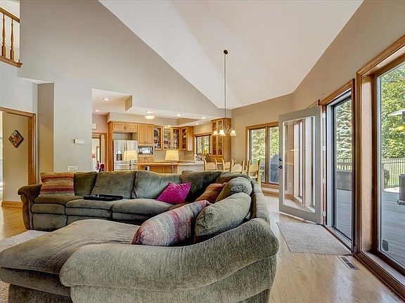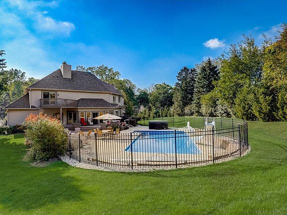 Beautiful 4 BD 3.5 BA home on private .86 acre with amazing inground pool. Main level open floorplan has vaulted Family Room open to the kitchen, Dining Room w/ 9 ft ceilings, Living Room with 10 ft beamed ceiling & FP. Circular staircase leads to second level. Master Suite with FP, vaulted ceiling, large WIC & private deck overlooking the pool. Finished lower level with FP and full size windows. Perfect entertaining backyard with inground pool, firepit & hot tub. Large side yards for the kids to run and play. Circular driveway. 4 fireplaces. Convenient location with easy access to Bluemound & I94. Roof 2020, A/C 3 yrs, Water heaters 3 yrs