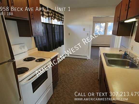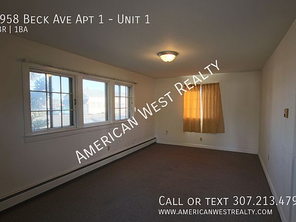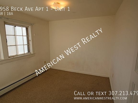Ground level apartment, end unit with parking right outside the door and a nice grass courtyard. Rent includes heat, water, and sewer. Tenant is responsible for their own electric and trash. Nice sized living room with big, bright windows. Kitchen includes plenty of cabinets, a pantry, fridge, stove, and dishwasher. Two bedrooms and bathroom opposite the living room. A bonus room is located off the kitchen and makes for great storage, hobby room, office, etc. Small pet negotiable for an additional fee. No smoking. NOTE: Owner is a licensed REALTOR in the State of Wyoming. _____________________ A $50 Lease Preparation Fee is due with your Holding Deposit. All residents are enrolled in the Resident Benefits Package (RBP) for $46.95/month, which includes renter's insurance, credit building, $1M Identity Theft Protection, HVAC air filter delivery, move-in concierge service, resident rewards program, and more! Learn more at TENANT RESOURCES > APPLICATION AND RENTING POLICY. _____________________ General requirements: All occupants 18+ must apply and be approved $30 application fee per person Submit a government-issued picture ID Prove combined income of 3x monthly rent _____________________ The information presented is deemed reliable, but is not warranted. Interested parties are responsible for inspecting and confirming the accuracy, completeness, currency, and status of all information before renting. _____________________ INVESTORS: Are you looking for professional property management or a sales agent? Contact American West Realty and Management today to learn about our services! Heat Baseboard Hot Water Kitchen Dishwasher Kitchen Pantry Kitchen Refrigerator Kitchen Stove / Oven Utility Black Hills Energy Utility City Of Cody (Water, Electric, Sewer, Trash) Washer Dryer, Coin Operated