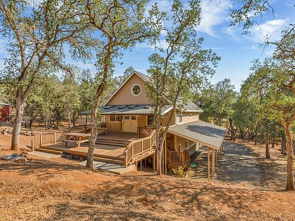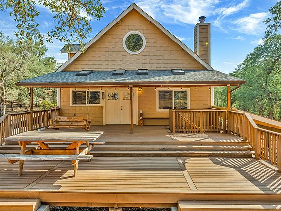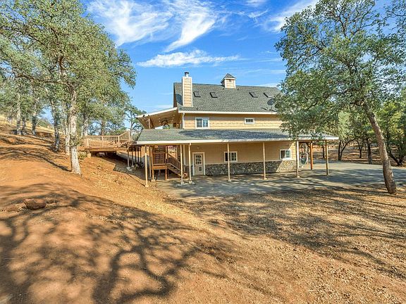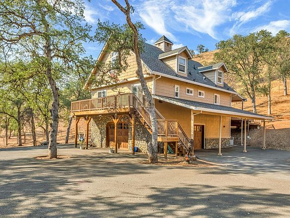 Modern Cowboy-Chic HVL Rancho on 5.54 acres! This unique property offers privacy, woodsy-charm, and room for animals too! The log-cabin feel of the hardwood floors, rustic accents, & beamed walls combines with custom spanish-tile accents to create a one-of-a-kind home! Open great room with soaring vaulted ceilings, large wood-burning fireplace & surround sound. Charming kitchen with tiled counters, large island, down-draft stove & built-in bench seating in the dining nook. Two large bedrooms, along with two full bathrooms, cozy office with built-in shelving, & laundry area are all on the main level. Upstairs the master suite has a level all to itself, en-suite bath with dual pedestal sinks, stall shower, & walk-in closet with built-ins. Bring your classic car collection & all the toys, because the entire bottom level of the home is the HUGE garage, with room for 4 vehicles, plus has built-in bar. Covered RV parking with hookups. Fenced area for animals & gated entrance to home.