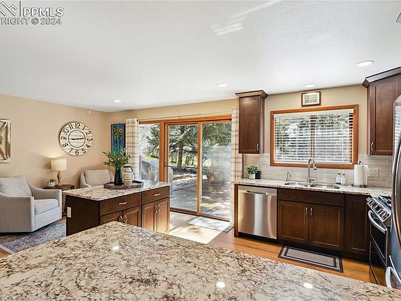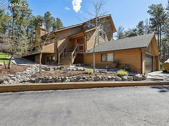 Introducing a captivating retreat nestled in the highly sought-after Top o' the Moor subdivision in Woodmoor. This stunning 4-bedroom, 3-bathroom home offers an unparalleled blend of elegance, comfort, and natural beauty. Upon entry, discover a beautifully updated home adorned with luxurious finishes that are flooded by natural light from the expansive windows throughout. The main level boasts a welcoming ambiance, with a large living room coupled with a fireplace and vaulted beamed ceilings, creating both a grand and inviting space. Enjoy casual meals in the cozy eating nook off the kitchen, which conveniently opens to the back deck for seamless indoor-outdoor living. Two additional bedrooms on the main level offer comfort and convenience, along with a dedicated laundry room for added functionality. The heart of the home is the custom kitchen, a culinary masterpiece featuring high-end appliances and thoughtful design. Upstairs, the private master suite beckons with its own private bedroom, highlighted by large sliding glass doors that open to a serene balcony overlooking the lush surroundings. Pamper yourself in the master bath, then revel in the expansive walk-in closet, providing ample storage for your wardrobe essentials. Descending to the basement, discover a versatile space designed for both relaxation and entertainment. A large and private bedroom awaits, complete with a living room featuring a gorgeous fireplace. Additionally, a large flex area offers endless possibilities for customization to suit your lifestyle needs. Outside, the large lot envelops the home in tranquility, offering a peaceful oasis surrounded by mature trees and nature's embrace. Experience the epitome of Colorado living in this exceptional home, where every detail has been carefully curated to provide the utmost in both comfort and style. Don't miss your opportunity to make this extraordinary property your own.