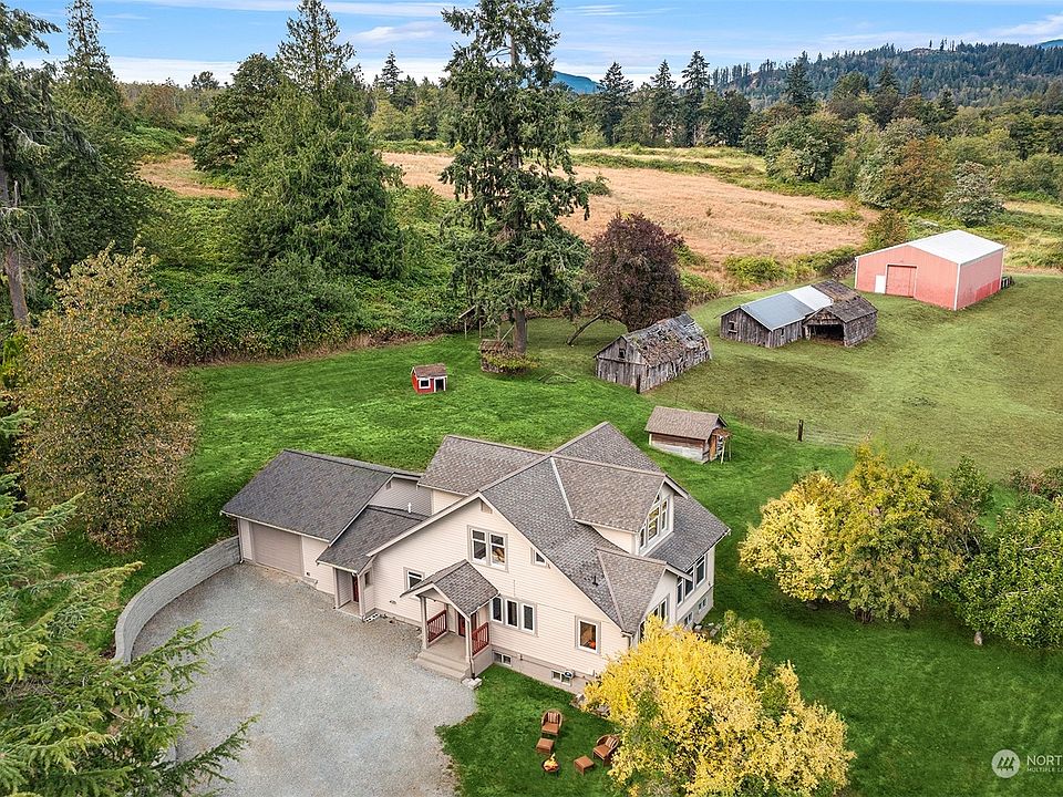 35+acres in Burlington!Live large with a country feel yet minutes to everything!Incredibly charming home w/expansive wood wrapped windows leading to breathtaking views,solid wood doors & stunning fir floors throughout.A beautiful banister staircase leads to a vaulted primary w/a walk in & additional room that could easily be another bdrm.Adtl bdrm & .75 bath also on the upper flr.Main floor hosts an open concept eat-in kitchen & dining,exquisite chair rail throughout,2 more bdrms & a classic claw foot bath.Large laundry rm leads to an attached,drive through garage.Huge barn w/4 oversized stalls & so many opportunities.Unfin-1k+sqft basement w/outside entry lends a world of possibilities.Rolling pasture space,serenity & so much room to roam!