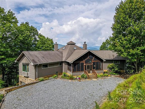 Privately situated on High Top Mountain and surrounded by over 28 acres of lush forests and private hiking trails, this breathtaking home was custom designed to take advantage of the stunning panoramic mountain view spanning from Cowee Mountain to the Clingman's Dome and beyond! The mountain inspired architectural design of this home blends beautifully into its natural environment and centerpieces around a large living, dining, kitchen area with dueling fireplaces and windows that encompass the view. The living spaces, primary ensuite, large executive style office and covered screened-in porch, perfect for entertaining are easily accessible on the main floor. High speed internet is also available at this home. Downstairs you'll find two guest bedrooms with private deck access, a large guest bath and flex space that is perfect for a second living room or workout room. There is also a 2 car garage and workshop area.
