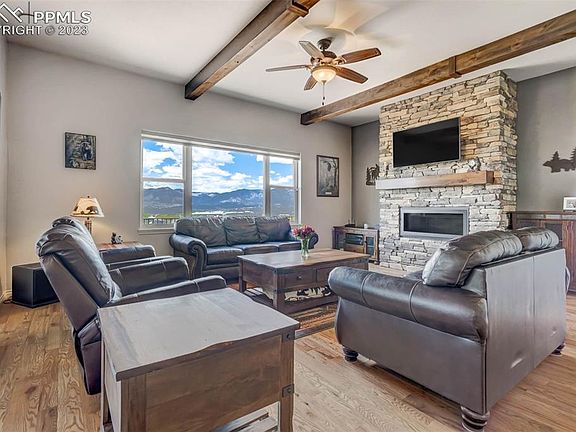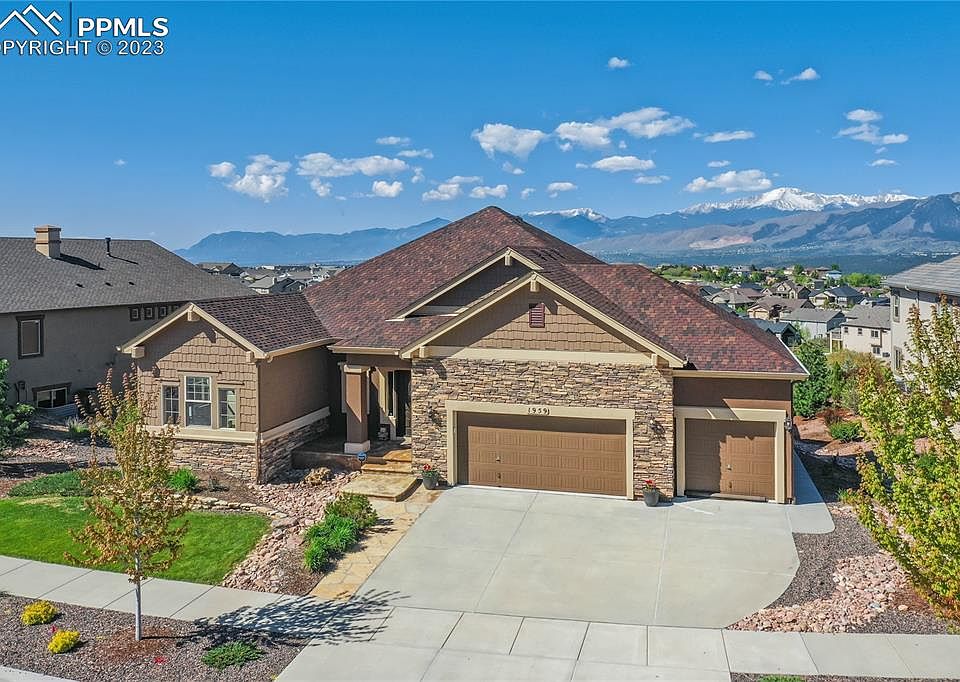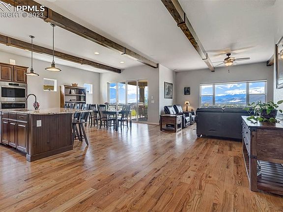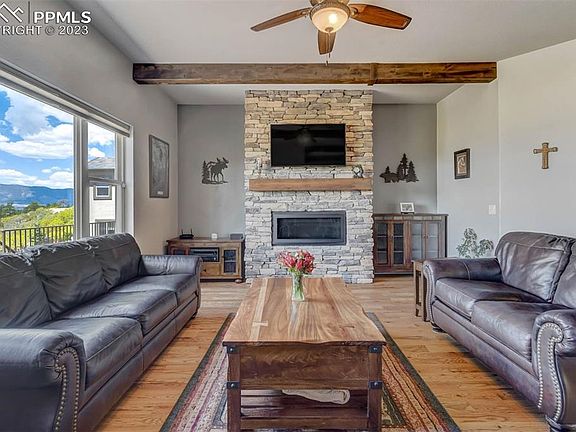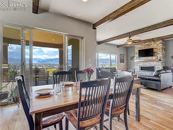 Experience luxury living in the prestigious Village of Milan at Flying Horse. Nestled on a private premium .39acre lot, offering awe-inspiring, unobstructed views of Pikes Peak & the USAF Academy. From the moment you step inside, you'll be captivated by the views that surround you. The grandeur of the open floor plan becomes apparent as you enter the living rm, kitchen, & dining rm. Beamed ceilings, flr-to-ceiling stacked stone FP, & oak hardwd flrs create an ambiance of sophistication & elegance. The kitchen is a culinary enthusiast's dream, feat Bosch gas cktp, dble wall mounted ovens, granite island w/breakfast bar, & dble sliding glass drs that lead to covered composite deck, w/picturesque views. This home has 2 bedrms & an office on the main lvl, incl the luxurious primary suite. Featuring dual walk-in closets, in-ceiling speakers, designer paint, solid wd flrs, & sliding glass dr capturing panoramic views. The 5pc bath offers custom tile work, dble vanities, a deep soaking tub w/chandelier lighting, & shower w/bench. Wrought iron railing leads you downstairs to the entertainer’s dream walk-out bsmnt. The open family rm w/electric radiant heated LVP flrs, in-ceiling audio, gas FP w/ stacked stone, & craftsman-built bar. Custom-designed bar has incredible woodwork, glass display cabinets, a live edge wood bar top, a 3-tap kegerator, a pro ice maker, a fridge/freezer, a side-by-side wine cooler, LED lighting & more. Unwind in the purpose-built theater w/stadium seating. The 2 basement bedrms have ample size & easy access to hall bath. The backyard amenities are just as impressive. Outdoor kitchen w/granite bar, built-in BBQ, flagstone patio w/ gas firepit, water feature, & hot tub. Garage w/Polyaspartic floor, Kobalt cabinets, & overhead storage. Additional items incl Central A/C, main lvl laundry w/sink & cabinets, central vac, & gas line on deck. Enjoy the convenience of being within walking distance to the Flying Horse Clubhouse, golf course, pool, & parks.
