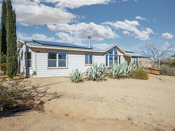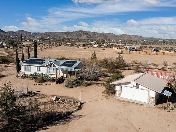 Spacious private home with 2 bedrooms + den (3 bedroom potential) & 2 baths set on 4+ acres in trendy Landers. Gated private property. Shaded front porch to enjoy the glowing sunsets & mountain views. Generous living room with large Palladian center window. Fireplace with hearth & mantle. Arched doorways with open upper walls between rooms. Carpet & laminate flooring. The den could be your office, library or even a third bedroom. Separate dining room. Kitchen boasts a skylight, ample cabinetry, refrigerator, big cupboard pantry, stove, extensive counter with a bow window. Main bathroom with shower, bath tub, & vanity. Substantial master bedroom with walk-in closet & master bath. Laundry room. Outside spa enclosed with a privacy wall. Detached 2 car garage. 40ft shipping container. Over 2 acres fenced. Numerous pine trees, cactus, cypress, agave, & an abundance of native plants. Horse property with solar system. Starry nights. Short drive to the famous La Copine restaurant, Giant Rock Meeting Room bar & cafe, & convenience stores. Not far to the Joshua Tree National Park which sees about 3 million tourists annually. Great opportunity for a vacation rental. Close to the Integratron, Giant Rock & Johnson Valley OHV area. Inspiring vistas of Goat Mtn, Spy Mtn, the Big Horn Mtns, & the Bullion Mtns. About an hour's drive to Palm Springs & Big Bear. Take delight in the abundant peace, serenity, & revitalizing nature of the Mojave desert.