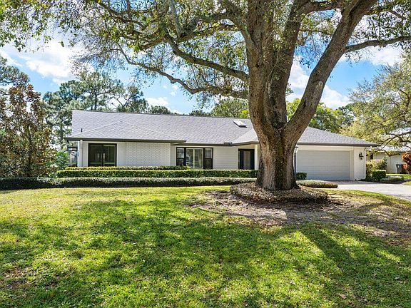 This warm & inviting home is situated on a generous sized lot spanning over half an acre within the oak tree lined streets of the sought-after subdivision of Whispering Trails. Split floor plan with 3 bedrooms, 2 bathrooms and a den offering spacious living areas perfect for relaxation and entertainment. With CBS construction and a brand-new roof providing peace of mind, this home is as practical as it is luxurious. The primary bathroom suite has been completely remodeled, including dual walk-in closets. Beautiful, engineered wood flooring throughout the bedrooms and main rooms. A private screened pool beckons for refreshing dips on hot summer days, while the expansive patio area provides plenty of space for lounging and soaking up the Florida sunshine. Surrounded by lush landscaping, this backyard retreat offers the ultimate in tranquility and seclusion.