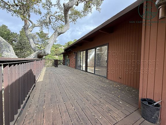 (MARSD) San Carlos Agency, Inc. presents this very spacious and nicely maintained three bedroom, two and one-half bath home a few minutes up the hill in the Chaparral/El Caminito neighborhood of Carmel Valley. Enjoy functionality, privacy and sunshine in this oasis nestled with oaks and very favorable indoor/outdoor livability. The living room has high, open-beam ceilings, hardwood flooring, fireplace, built-in shelving, and exits to the large deck area. Two bedrooms, including the primary, also exit to the expansive deck with beautiful abutting oaks to boot. The kitchen is huge with an adjacent dining area, island with electric cook-top, refrigerator with ice maker/water dispenser, dishwasher, double sink and secondary bar sink, and built-in electric wall oven and microwave combination. There is an abundance of storage and closet space throughout the property including multiple closets in the primary, ample hall closetry, and built-in shelving in the attached, two car garage. The laundry room is also very functional with a large sink, plenty of cabinetry and counter space as well as the side by side clothes washer and dryer units (left as a courtesy to tenants). Tenant pays all standard utilities but Landlord will pay for a gardener. No smoking. Pet negotiable. Contact San Carlos Agency, Inc.