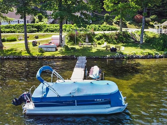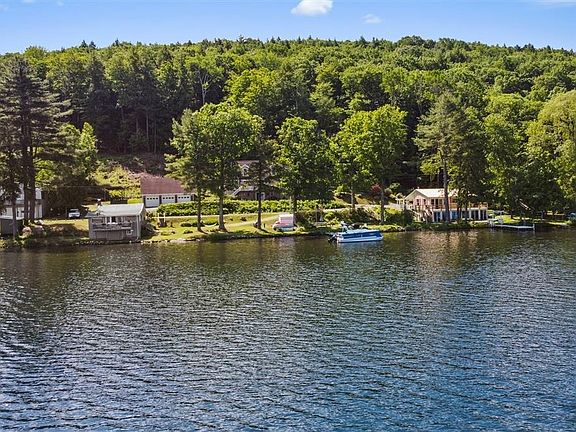 Impeccably maintained full time residence built brand new less than 14 years ago. 80' Lake frontage with beautiful landscaping all around house. The views from the deck are breathtaking! Step inside glass slider to open concept living room-dining room and spacious kitchen-with views of lake while doing dishes. 2 bedrooms and 2 full baths including master suite complete the first floor. Upstairs is unfinished, but plumbed and has electrical so it's all ready for another bathroom and at least 2 more rooms. Lower level has walk out to patio and a family room. Unfinished area has plenty of storage. Outside over-sized 3 bay garage 36'x30' and 10' doors with full walk up storage above. A pavilion for boat in winter as well. Steps to the lake front with perennials around and secluded by trees.