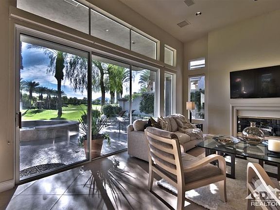 Beautifully appointed home with large back patio with spa looking south down #1 of the Grove golf course to the fabulous Santa Rosa Mountains. No homes across the fairway and tucked far behind the green. Recently remodeled, this home has newer tile floors with tall baseboards. Recently repainted in light colors. Glass tile backsplash with granite countertops in kitchen. All appliance are newer. Open floor plan with kitchen, family, bar area, living and dining room all open to the great views. Spacious master bedroom/bath with his/her vanities, walk-in closet, lock-off cabinets, step shower and separate bath tub. Two guest bedrooms (one without a closet. Truly a beautiful home with a spectacular view - a rare find indeed.