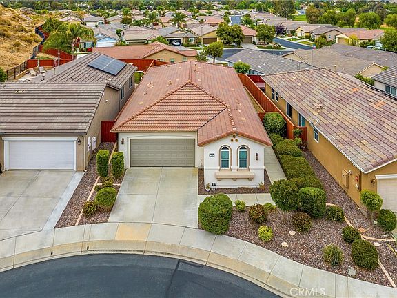 This is your chance to own a beautiful single level home in the exclusive Four Seasons community, designed for those 55 and over. This lovely home is situated on a quiet cul-de-sac with stunning mountain views, and features two bedrooms and two full bathrooms. Carpeting in the bedrooms, tile throughout the main living spaces, and ceiling fans in every room make this home comfortable and inviting. The main bedroom has a large walk-in closet and an attached bathroom with dual sink vanity, tile floors, private commode area, and walk-in shower. The easy-care yard features low maintenance landscaping with an Alumawood patio cover in the back, and all plants are on an automated drip system. In addition, the community offers many amenities, including 24 hour security, a bistro, ballroom, theater, game room, billiards room, library, gym, salon, covered BBQ area, pool, spa, bocce courts, shuffleboard, tennis and pickleball courts, you're also close to casinos, Diamond Valley Lake, and Temecula Wine Country. Just 40 miles from Palm Springs, 65 from San Diego, and 80 from Los Angeles. This is a great opportunity to own a piece of California paradise.